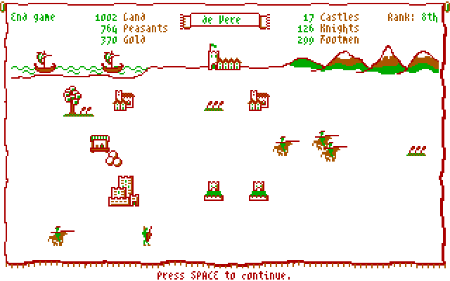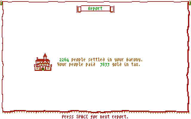 One fun thing to do at the final rankings screen is to compare the image of the winning barony (especially if it's yours) with the image of the 8th place barony. Typically the winning barony will have abundant and large buildings, while the losing barony appears emaciated, with just a few small villages and farms scattered around.