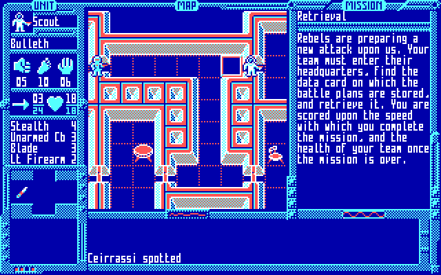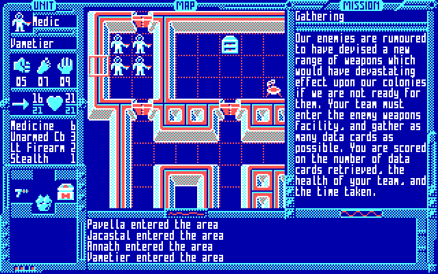 For this reason, entering a large room can be intimidating. You've no idea how many enemies are lurking behind that door, and if they have action points left they can fire on you. This is a good time to make use of Stealth. Having a unit with a good Stealth skill creep into the doorway allows you to see how much danger there really is. Make sure you don't leave your unit in the doorway though, or they will be seen and attacked during the enemy turn! If the Stealth capable unit, usually a Scout, isn't too strong at combat, then you might want to withdraw them from the room and bring stronger units forward to deal with the enemies you find.